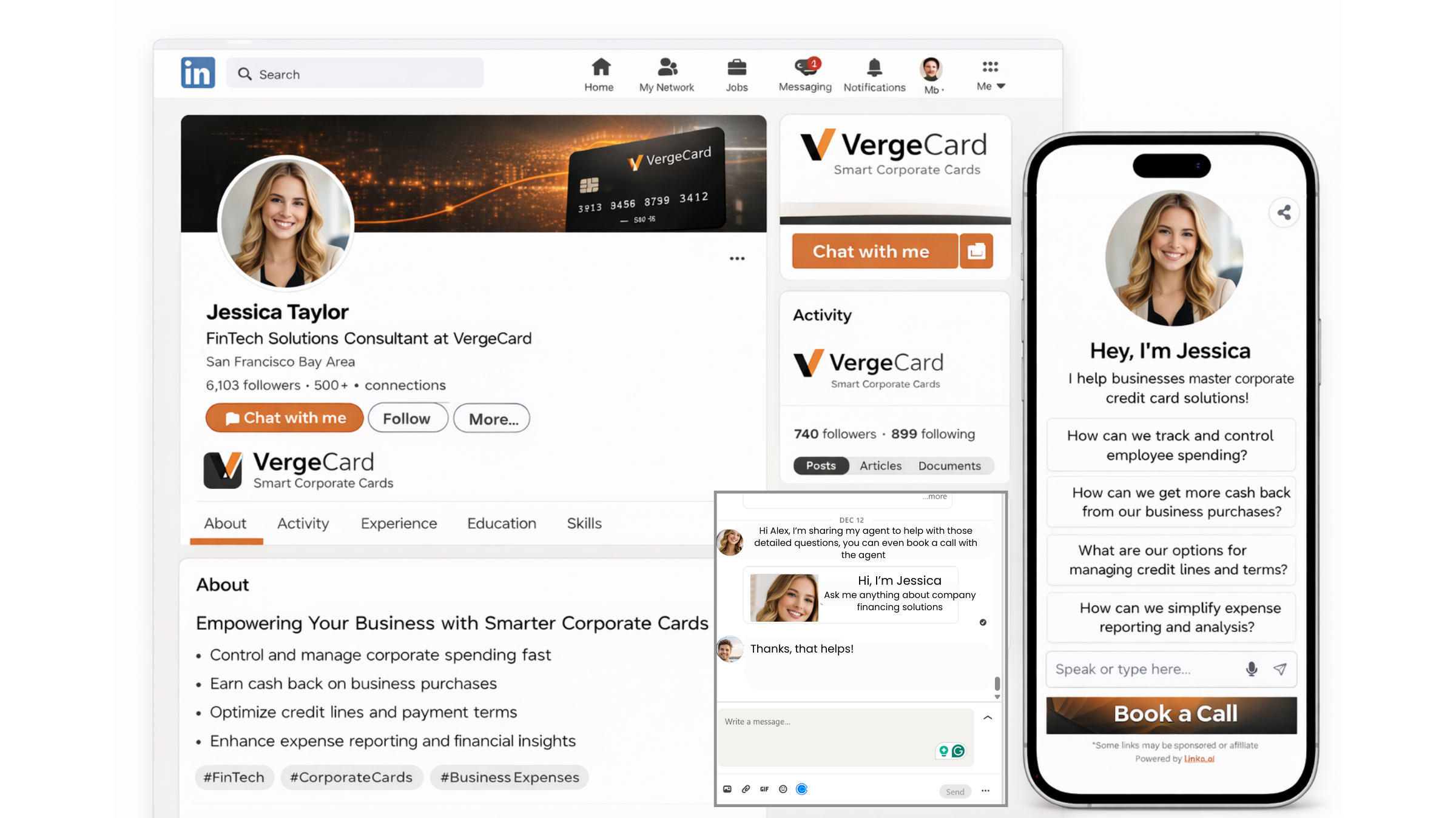 Your Personalized AI Agent engages visitors and audiences in real time, answers questions, recommends the right offers, captures contact information, and helps convert interest into clients, customers, or sales — saving you hours of time on repetitive responses and link sharing.