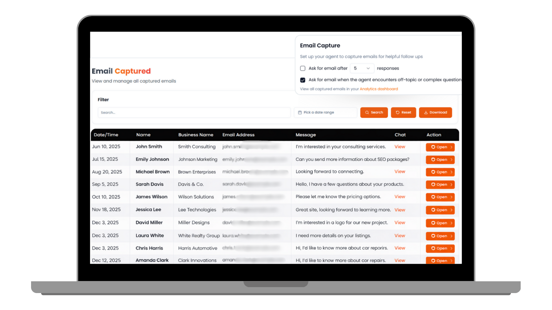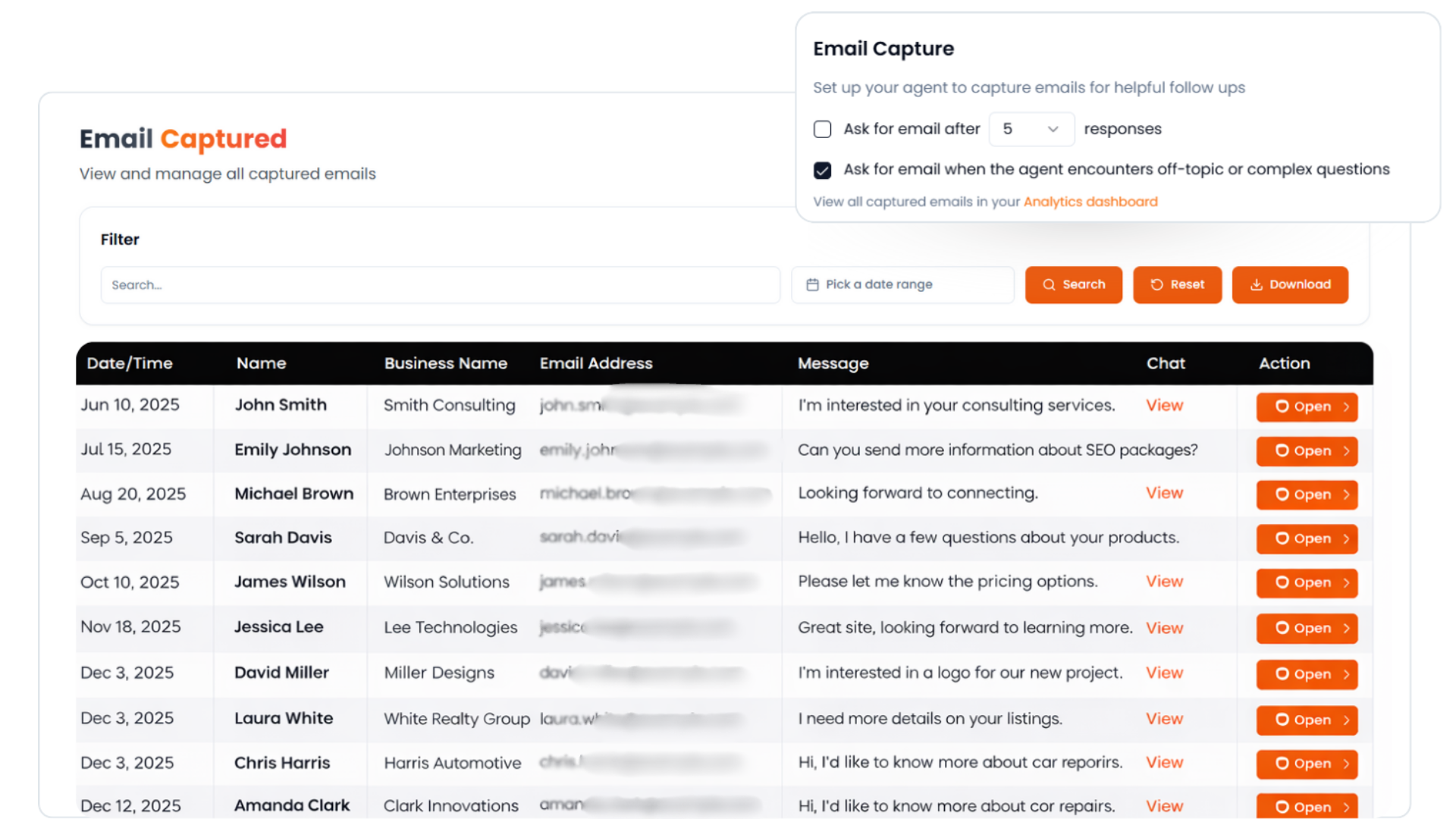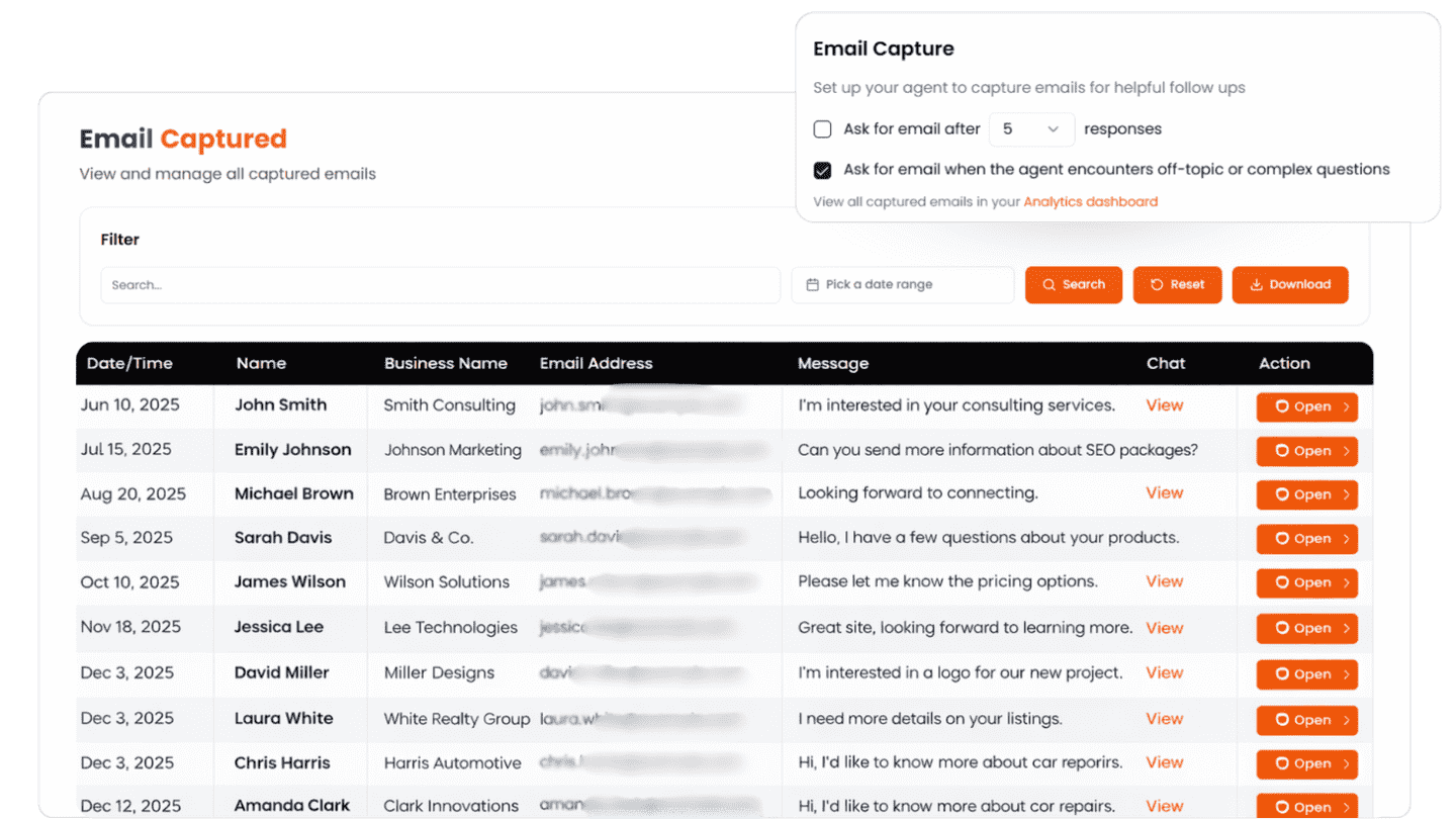 Yes. Your Agent can capture emails and other contact details during conversations, along with conversation history, so you can follow up with qualified leads. You can also use our Zapier integration to connect all data to your CRM and 1000s of other apps.